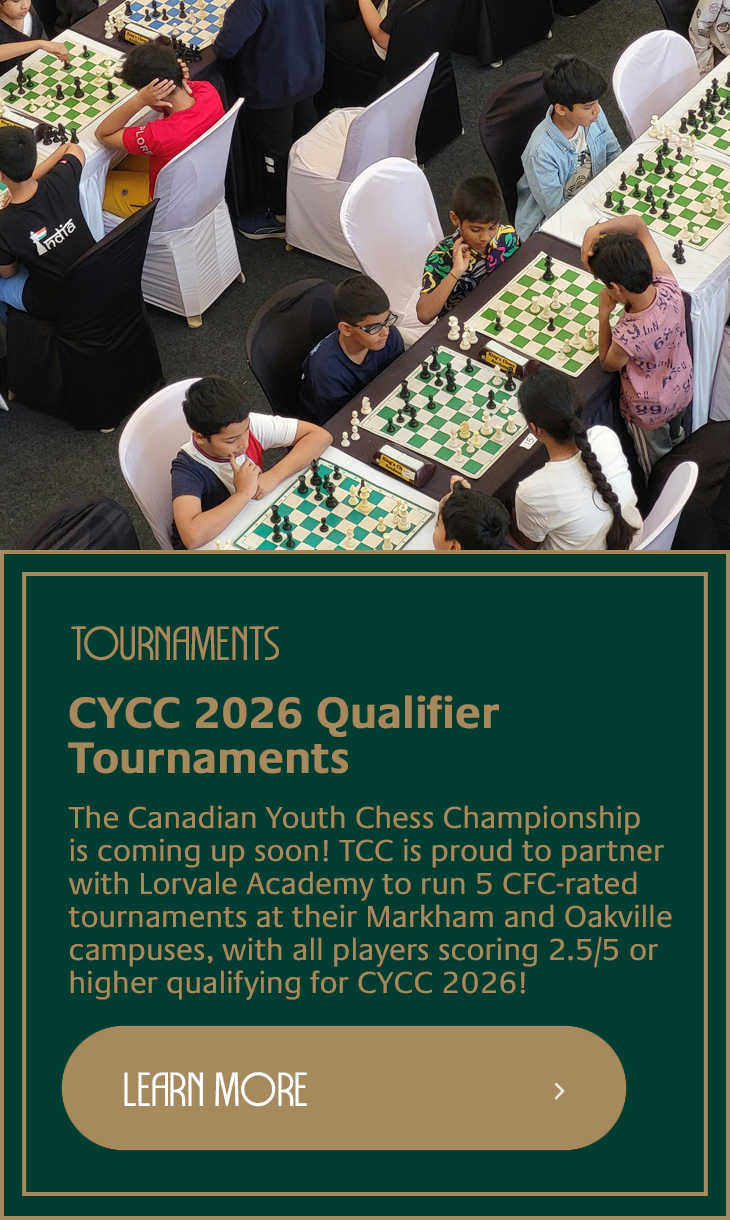 The Canadian Youth Chess Championship is coming up soon! TCC is proud to partner with Lorvale Academy to run 5 CFC-rated tournaments at their Markham and Oakville campuses, where all participants who achieve a 2.5/5 score or higher will qualify for this year’s CYCC!
